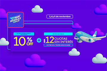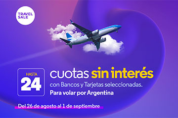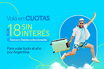 ¿Todavía no compraste? Hasta 6 cuotas sin interés con tarjetas bancarias Visa, MasterCard, Cabal y con todas las tarjetas American Express emitidas en Argentina, o en 6 cuotas cero interés con NaranjaX; para volar por Argentina hasta el 30 de noviembre de 2024. |