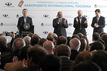 La nueva pista del Aeropuerto Benjamín Matienzo quedó inaugurada hoy en un acto en la Terminal con la presencia del presidente de la Nación, Mauricio Macri; del ministro de Transporte, Guillermo Dietrich; del gobernador de Tucumán, Juan Manzur; del presidente de Aeropuertos Argentina 2000, Martín Eurnekian; del presidente del ORSNA (Organismo Regulador del Sistema Nacional de Aeropuertos), Patricio Di Stefano y autoridades provinciales y locales. |