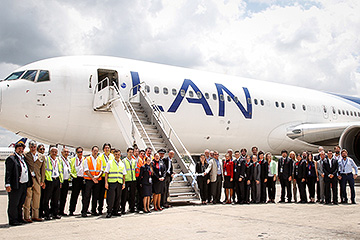 En un acto realizado hoy en el Aeropuerto Internacional de Ezeiza que contó con la presencia del Ministro de Transporte de la Nación Guillermo Dietrich, el Administrador Nacional de ANAC Juan Pedro Irigoin, el Gerente General de Intercargo, Mario Agustín Dell´Acqua, la Gerente General de LATAM Airlines Argentina Rosario Altgelt y personal de LATAM se celebró la incorporación del tercer Boeing 767-300 a la flota de LATAM Airlines Argentina. |