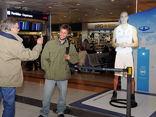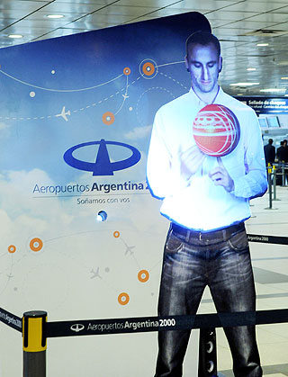 Durante las 24 horas y en los dos aeropuertos más importantes de la Argentina, el jugador bahiense, capitán de la Selección Argentina de Básquet que compite en los Juegos Olímpicos de Londres, se convierte en un guía especial que interactúa con los muy sorprendidos viajeros.