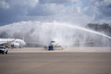 Aerolíneas Argentinas presentó este miércoles su primer avión exclusivo de carga. El evento se realizó en la terminal FBO del Aeropuerto Internacional de Ezeiza y, como es costumbre en la industria, la nave recibió su bautismo atravesando el arco de agua que las autobombas de ANAC forman cada vez que ingresa una nueva unidad.
