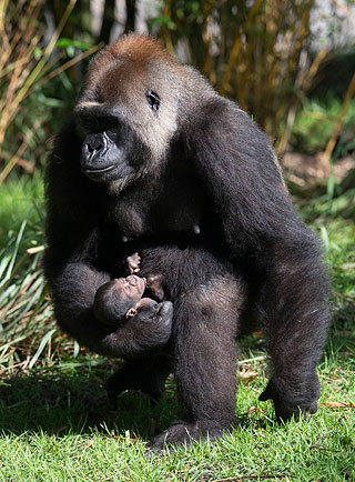 • Tras un embarazo de casi nueve meses, las gorilas hembras dan a luz un crío que típicamente pesa sólo cuatro libras. Tras el nacimiento, los pequeños gorilas se aferran a la piel de sus madres por los primeros meses, luego se cuelgan en las espaldas de sus madres por los primeros dos o tres años de sus vidas.