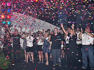 Operadores celebran el final de la noche con una lluvia de confeti.