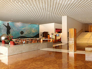 Al entrar al hotel nos topamos de frente con un mural de más de 60 metros cuadrados, representativa del arte mexicano de mediados del siglo pasado. Este óleo de Rufino Tamayo, corresponde al mejor momento del muy cotizado artista. Es un sencillo dibujo con unas cuantas líneas, en el que Tamayo aplicó todo su aprendizaje sobre el color. Grises y violetas en el fondo logran que un turquesa intenso brille y otorgue a la obra la sensación de mirar un espacio que avanza y retrocede con vida propia. Es considerada por expertos como la mejor obra de Tamayo.