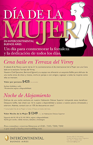 El sábado 8 de marzo, día de la Mujer, Intercontinental Buenos Aires presenta una Cena-baile en la exclusiva Terraza del Virrey a partir de las 21 horas.