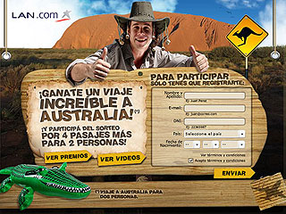 | LAN, anunció que hasta el 30 de noviembre todas aquellas personas que ingresen en LAN.com y registren sus datos podrán participar del concurso “Viajá a Australia sin hacer casi nada”. Los interesados sólo deberán entrar en LAN.com, hacer clic en el banner de la promoción donde podrán completar el formulario de inscripción y automáticamente estarán participando del sorteo de: