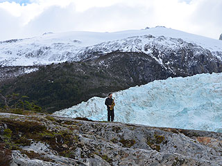 No llegó a verse pero se escuchó el característico sonido seco que producen los desprendimientos en unas de las paredes internas. El ventisquero se muestra como un gran muro congelado con paredes de tono azulado de 300 metros de altura . Desde la misma planicie se aprecia una excepcional vista panorámica del cordón Darwin, con cumbres nevadas con nieve inmaculada blanca caída durante la noche