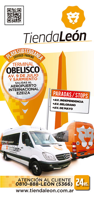 Manuel Tienda León, empresa líder en el traslado de pasajeros desde y hacia los aeropuertos en servicios Pre y Post Aéreo, acaba de incorporar un nuevo servicio. Creó una nueva Terminal en el Obelisco (Av. 9 de Julio y Sarmiento) que se suma a la de Av. E. Madero 1299, esquina San Martín (Retiro). Una alternativa acertada que favorece a viajeros hospedados en hoteles del centro de la ciudad que necesitan trasladarse al Aeropuerto Internacional Ezeiza o viceversa y al personal de la estación aérea que en pocos minutos -sin exponer su auto al tráfico porteño y a las abusivas tarifas de estacionamiento- llega al epicentro de la Ciudad de Buenos Aires. Desde las Playas Subterráneas del Obelisco brindan servicio todos los días de la semana con unidades Sprinter con paradas en Independencia, Belgrano y Av. de Mayo. Para información y reservas llamar a Atención al Cliente 0810-888-LEON(5366) las 24 horas, o ingresar a www.tiendaleon.com.ar