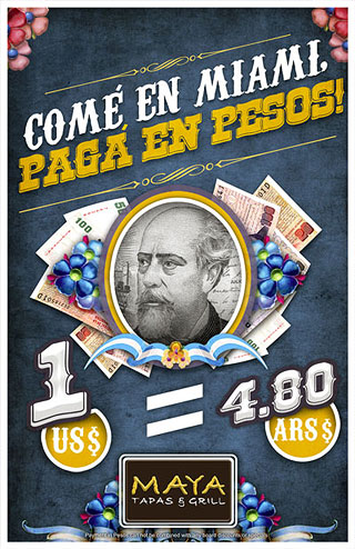 Maxi González y su familia se acomodaron en el Maya Tapas and Grill de la famosa Lincoln Road de Miami Beach para disfrutar de unos buenos bifes con ensalada. Era la primera noche de unas vacaciones de una semana para esta familia argentina que se disponía a comer todos los días en el mismo restaurante. ¿La razón? Aceptan pesos argentinos.