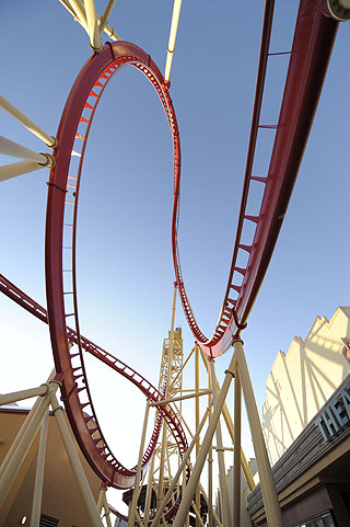 Caes desde un ascensor vertical a 65 millas por hora y asciendes dentro de la Doble Toma, la curva no invertida mas larga del mundo. Pasas volando hasta alcanzar el tope, donde un giro inesperado te lleva afuera de la vía y recorres la curva en el tope. Haces otro giro de vuelta para el descenso. La Doble Toma mide 136 pies de altura y su diámetro más largo es de 103 pies.