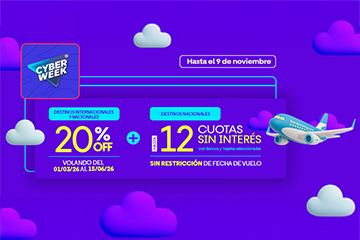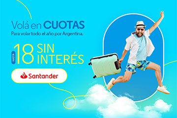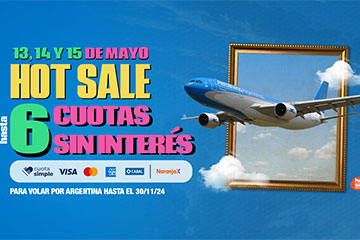 ¿Todavía no compraste? Hasta 6 cuotas sin interés con tarjetas bancarias Visa, MasterCard, Cabal y con todas las tarjetas American Express emitidas en Argentina, o en 6 cuotas cero interés con NaranjaX; para volar por Argentina hasta el 30 de noviembre de 2024. |