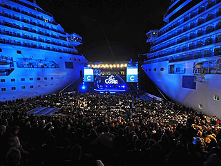 Pero la celebración recién comenzaba. Por la noche hubo una cena de gala para 4.000 invitados, incluyendo algunos pasajeros de los cruceros inaugurales de ambos barcos. El restaurante del Costa Pacifica sirvió un menú con 100% comida italiana realizado por dos Chefs galardonados con estrellas Michelin: Ettore Bocchia, chef ejecutivo del Grand Hotel Villa Serbelloni en Bellagio y Chef corporativo de Costa Cruceros, y Pino Cuttaia, chef en el restaurante La Madia en Licata.