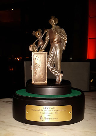 Sharon Siskie en medio del coctel sorprendió a Gabriel Sánchez de All Seasons uno de los tour operadores mayoristas más prestigiosos de la argentina con un reconocimiento público a su trabajo encomiable haciéndole entrega de una estatuilla del ratón más famoso del mundo junto a su creador Walt Disney.