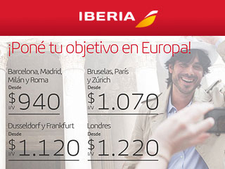 La aerolínea española ofrece tarifas por 940 dólares, ida y vuelta, de Buenos Aires a Madrid, Barcelona, Roma o Milán; a Bruselas, París o Zurich por 1.070 dólares; a Frankfurt y Dusseldorf por 1.120 dólares y a Londres por 1.220 dólares. Estos precios no incluyen cargo de emisión ni percepción del 35% correspondiente a la Resolución AFIP 3550.
