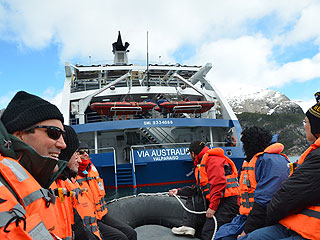 Ya en Ushuaia el misterio empezó a develarse cuando luego de cumplir con los trámites migratorios, en el puerto aguardaba el Crucero de Expedición Vía Australis para el embarque. Un barco chileno construido en Valparaíso en el 2005 al mejor estilo de los europeos, con 64 cabinas para 136 pasajeros, con 71,83 mts. de eslora y 13,4 mts. de manga sirvió de hospedaje durante dos noches navegando por los canales fueguinos en aguas del canal de Beagle, -descubierto por el capitán Fitz Roy- costa Sur de Tierra del Fuego.