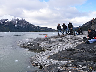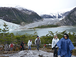Una explanada móvil especialmente diseñada para el desembarco de los botes impidió que se chapuceara en la orilla preservando seco el calzado de montaña. En fila india se inició un trekking por un ascendente sendero rocoso, aún húmedo por la reciente presencia de hielo y nieve en la zona. Las raíces ramificadas mojadas aferradas a las rocas provocaron más de una caída tanto en el ascenso como en el descenso. Regulando el aire, y asistidos por pasamanos de soga que delineaban el camino, luego de quince minutos de subida se llegó a un mirador. Desde allí se pudo contemplar la magnitud del Glaciar Pía cincelado a su antojo por la erosión el viento, su principal escultor.