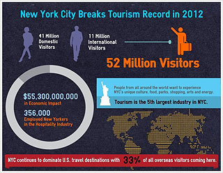 El Alcalde Michael R. Bloomberg y el Ceo de NYC & Company George Fertitta anunciaron que Nueva York dio la bienvenida a un nuevo record, 52 millones de visitantes en el 2012. Un record histórico y un incremento del 2.1 por ciento con respecto al año 2011. Los visitantes generaron un estimado de 55.3 billones de Dólares con un impacto económico para la economía de la ciudad y un gasto directo de 36,9 billones de Dólares. Nueva York sigue siendo la ciudad dominante en cuanto a destinos en Estados Unidos con un alto porcentaje en el mercado internacional con un record del 33 por ciento. En el 2012 Nueva York le dio la bienvenida a 41 millones de visitantes nacionales y 11 millones de visitantes internacionales. Además de esto Nueva York vendió la cifra record de 29 millones de noches de hotel generando otro record de 504 millones de dólares en recaudación de impuestos hoteleros. La industria hotelera emplea ahora a 356.000 neoyorquinos repartidos en los cinco distritos. El Alcalde realizó el anuncio en el Museo Americano de Historia Natural, una de las instituciones culturales emblemáticas de la ciudad, y fue también acompañado por TKTK y las Rockettes.