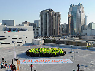 Orlando nos sorprende día a día, su gente no da descanso a su imaginación y genera eventos y acontecimientos que ayudan a mantener viva la presencia de la ciudad más divertida -y a su vez seria- del planeta, en un mundo que se divide entre los que alguna vez la visitaron y entre los que alguna vez le gustaría ir. Quinientas personas sonrientes de los cinco continentres se reunieron el 1 de octubre en la capital universal de los parques temáticos para establecer el récord mundial Guinness para la carita feliz más grande. Coincidiendo con la celebración del día oficial World Smile Day® (Día Mundial de las Sonrisas), formaron la carita feliz y se pararon hombro a hombro durante diez minutos en el estacionamiento superior del nuevo estadio Amway Center, hogar del Orlando Magic de la NBA.