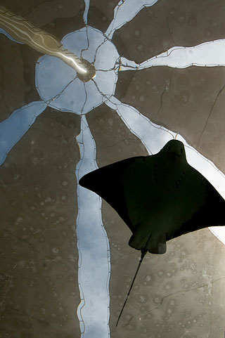 El acuario de Manta, con 378 mil litros de agua, está poblado por centenares de peces de California y tres especies de rayas: rayas murciélago de California, rayas diamante y las que se conocen como peces guitarra. Ambientado como un arrecife, el acuario tiene 8 ventanales panorámicos de acrílico para que los visitantes puedan apreciar la vida marina frente a ellos y encima de sus cabezas. También hay una piscina de poca profundidad, elevada sobre el suelo, donde los visitantes pueden tocar y alimentar a las rayas murciélago de California. Esta experiencia tan cercana permite a los visitantes establecer una conexión con estas criaturas marinas que los puede inspirar a proteger a esta especie, cuidando su hábitat natural oceánico y el medio ambiente en general.