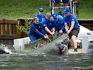 El equipo de rescate de animales de SeaWorld transportó a la manatí de 3 metros y 626 kilos al parque para evaluar su condición general y curarla. Después de una evaluación medica, se decidió amputarle una aleta severamente dañada y vendarla. La manatí recibió antibióticos y el tratamiento completo para curar sus heridas. Su estado de salud comenzó a mejorar.