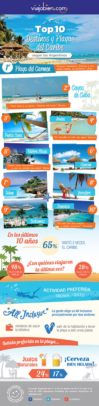 La agencia de viajes online, Viajobien.com realizó un estudio sobre cuáles son las playas caribeñas preferidas por los viajeros. Los resultados de la encuesta, a casi 2000 participantes, también señalaron cuántas veces visitaron estos destinos de sol y playa durante los últimos años, junto a quienes viajaron, las actividades más recomendadas y hasta por qué motivos es conveniente alojarse en un resort all inclusive.